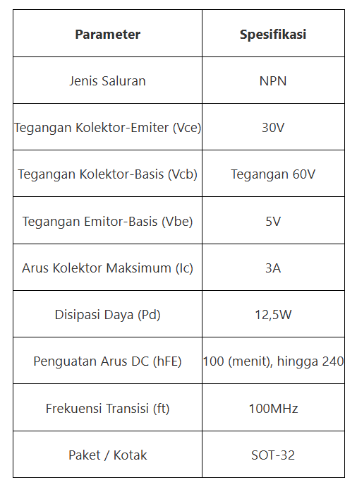 Transistor D882 , juga dikenal sebagai 2SD882, adalah transistor sambungan bipolar (BJT) NPN berdaya sedang yang umum digunakan dalam aplikasi amplifikasi dan switching untuk keperluan umum. Transistor ini dirancang dengan teknologi planar, menawarkan kinerja yang andal dan kemampuan penanganan arus yang moderat. Transistor ini memiliki tiga lapisan material semikonduktor dengan tiga terminal—emitor, basis, dan kolektor. Transistor ini memberikan amplifikasi arus yang efisien dengan rentang penguatan antara 60 dan 400, sehingga cocok untuk sirkuit berdaya rendah. Selain itu, D882 dapat dipasang pada heatsink melalui lubang sekrup pada paket SOT-32-nya, sehingga meningkatkan pembuangan panasnya selama operasi.